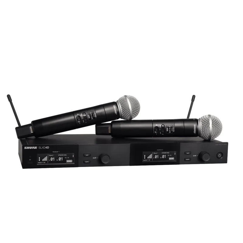 Cada sistema se suministra con un receptor dual SLXD4D, dos transmisores de mano SLXD2/SM58, antena, accesorios de montaje en rack y 4 pilas AA.