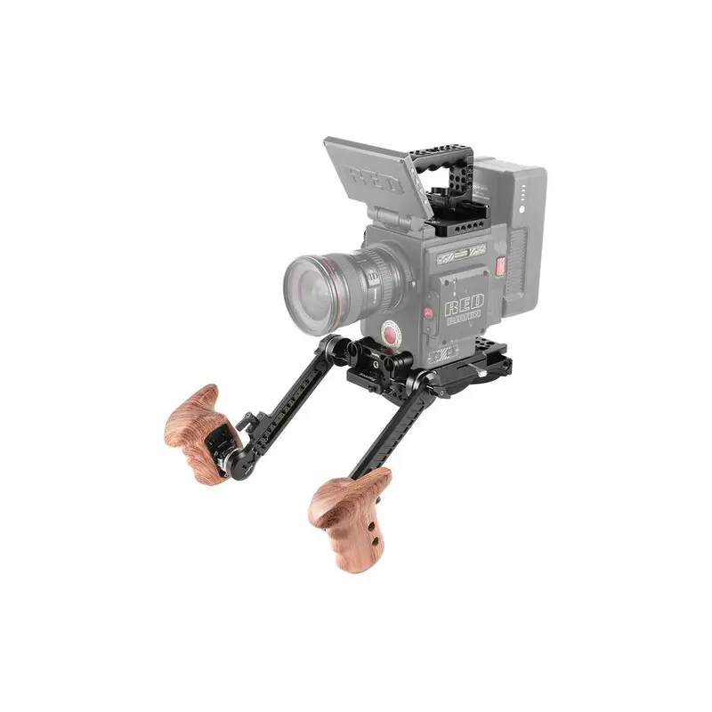 El kit de accesorios 2102 Pro para RED DSMC2 de SmallRig le permite capturar cómodamente tomas de mano con su cámara DSMC2. Este kit incluye una cola de milano estilo ARRI y una placa de puente deslizante, una hombrera contorneada, un plato de queso superior, un asa superior de riel NATO y brazos telescópicos con empuñaduras de madera.