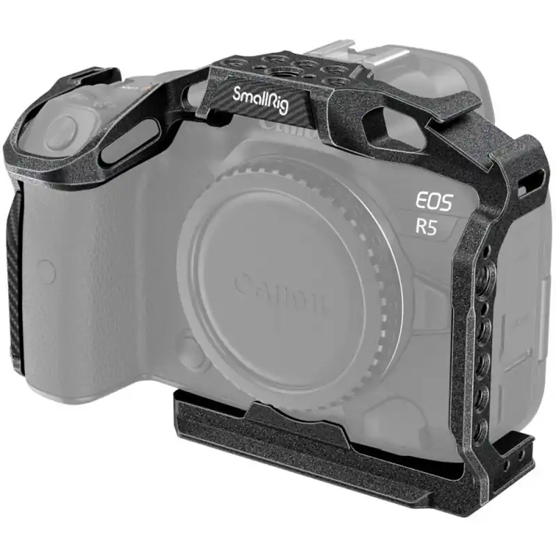 Proporcione protección y montaje de accesorios para su cámara Canon EOS R5 o R6 con la carcasa de aluminio liviana «Black Mamba» de SmallRig. Esta jaula de ajuste de forma presenta un elegante acabado negro rugoso con detalles de estilo de fibra de carbono, mantiene el acceso a los controles de la cámara, la batería y la ranura para tarjeta SD, y cuenta con una variedad de opciones de montaje.