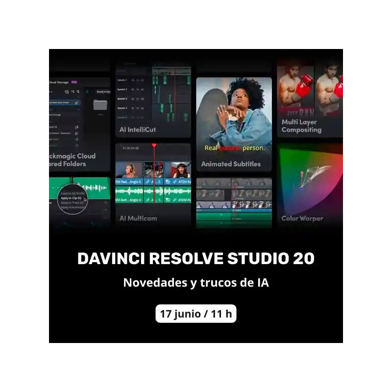 Solo Hoy MQV MASTERCLASS DAVINCI RESOLVE STUDIO (11 h) Domina las nuevas herramientas de Inteligencia Artifical en DaVinci Resolve Studio 20. Turno 11 h