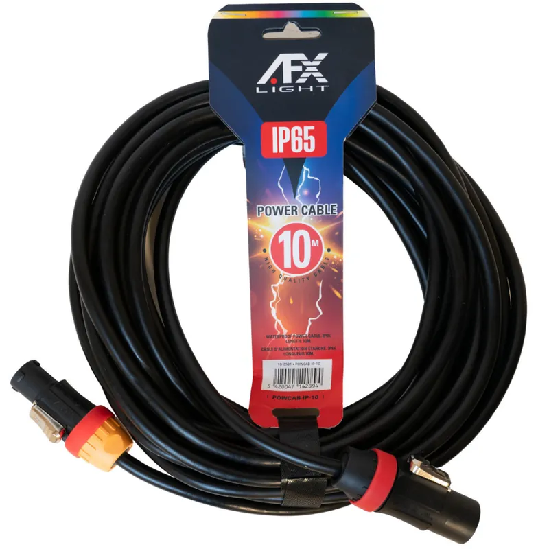 Con una certificación IP65, este cable es resistente al polvo y a chorros de agua, lo que lo hace ideal para su uso en exteriores o en entornos húmedos. Ya sea en festivales, conciertos al aire libre o instalaciones permanentes, el AFX POWCAB-IP-10 ofrece un rendimiento fiable.