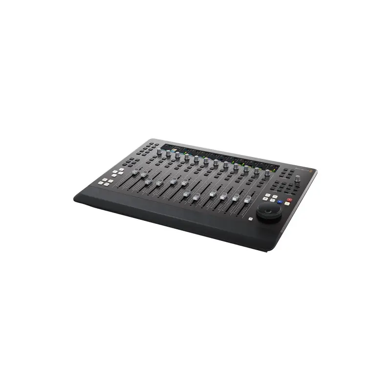 Controladora de audio profesional con 12 faders motorizados, pantalla HDMI y navegación avanzada para proyectos de audio y postproducción.