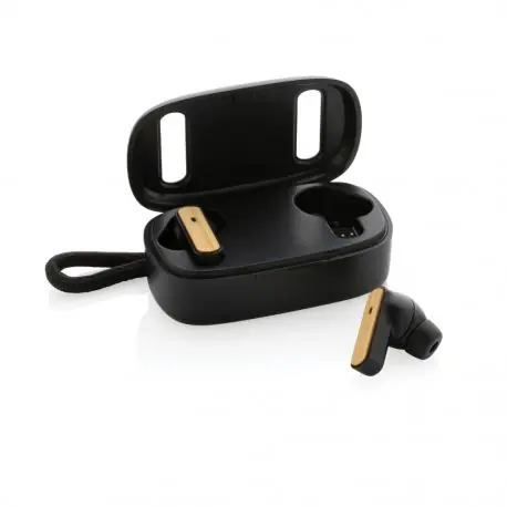 Auriculares inalámbricos FSC® 100% bambú de próxima generación en estuche de carga de ABS reciclado RCS. Los auriculares y el estuche de carga están fabricados con ABS reciclado certificado RCS (Recycled Claim Standard). Contenido reciclado total: 58% basado en el peso total del artículo. La certificación RCS garantiza una cadena de suministro completamente certificada de los materiales reciclados. Los auriculares perfectamente ajustados tienen una batería de 40 mAh y se pueden recargar en el estuche de carga de 400 mAh en 1 hora. Con función de emparejamiento automático fácil con tu dispositivo móvil. Tiempo de reproducción a volumen medio unas 5 horas. Con BT 5.3 para una conexión óptima. Distancia de funcionamiento de hasta 10 metros. Con pick up y micro. Incluye almohadillas de silicona de 3 tamaños. Incluye cable de carga TPE reciclado certificado GRS. Presentado en embalaje kraft mixto FSC®. Artículo y accesorios 100% libres de PVC.
