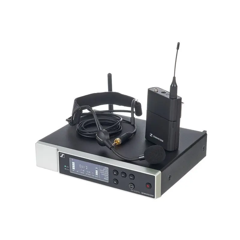 Set Lavalier digital inalámbrico todo en uno para quienes hablan, con el famoso micrófono de diadema cardioide ME 3 de Sennheiser.