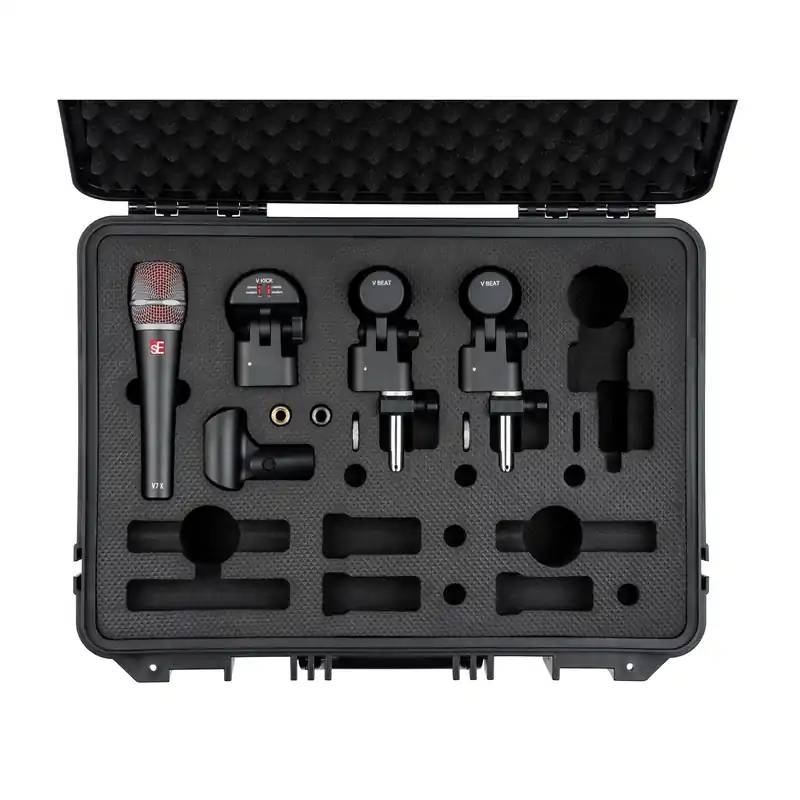 - Si ya tienes micros de ambiente generales para tu batería, sE Electronics «V Pack Venue suministra el resto de los micrófonos que necesita para sonorizar tu batería y hacer que suene genial.