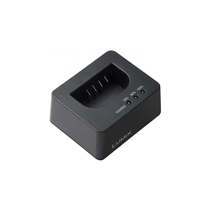 El cargador de batería DMW-BTC15 , diseñado para usarse con la batería de iones de litio recargable Panasonic DMW-BLK22, es un medio eficaz para mantener las baterías cargadas. El compartimento de carga tiene indicadores LED de estado e incluye un adaptador de CA y un cable USB tipo C.