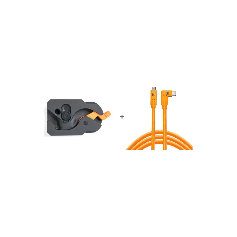 Optimice sus tomas con conexión a red con el kit de cable USB-C a USB-C en ángulo recto TetherGuard LeverLock Plate y TetherPro de Tether Tools . Este práctico paquete incluye un cable de conexión macho USB-C a USB-C en ángulo recto de color naranja de alta visibilidad de 15 pies, que se puede asegurar a su cámara mediante la placa TetherGuard LeverLock Plate. Un canal en forma de S en la parte inferior de la placa facilita la configuración y el desmontaje de las tomas, ya que le permite conectar o desconectar el cable sin tener que quitar la placa.