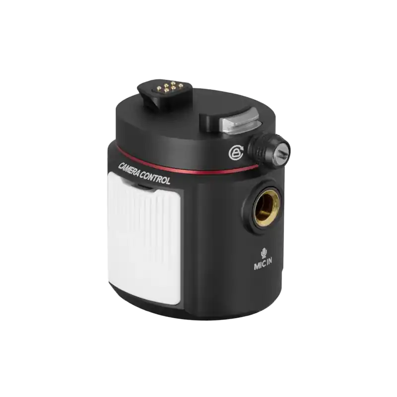 El módulo de expansión Crane M3 de Zhiyun-Tech se conecta a la parte inferior del cardán. El módulo amplía la funcionalidad del cardán con audio y conectividad Bluetooth. Un conector magnético con un pasador de bloqueo conecta el cardán al módulo. Un compartimento integrado con un puerto USB tipo C le permite insertar el módulo de control Bluetooth disponible por separado. El módulo también tiene una entrada de 1/4″ para un puerto de audio adicional.