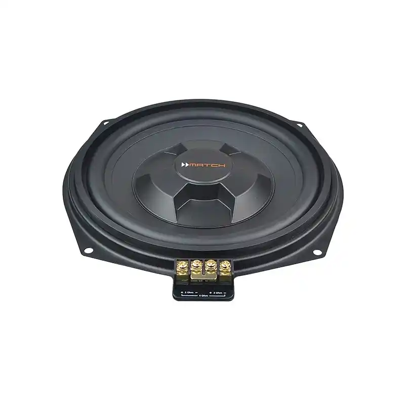 Los subwoofers extraplanos de 8″ Match UP W8BMW D de la serie Plug & Play para BMW admiten una potencia de 400 W. Gracias a su cono de fibra de vidrio excepcionalmente rígido se reproducen de forma extremadamente dinámica y contundente generando la máxima presión de sonido sin distorsiones.