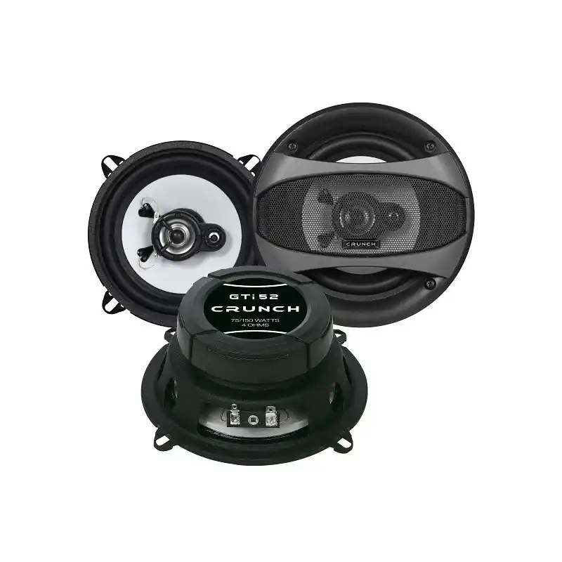 El kit de altavoces coaxiales Crunch GTi 52 de 5.25″, 2 vías de la serie GTi soporta una potencia de 150 w, cuentan en su fabricación con una membrana del woofer en Polipropileno blanco, un robusto chasis de acero, el tweeter tiene una cúpula de Mylar junto a un imán de neodimio.