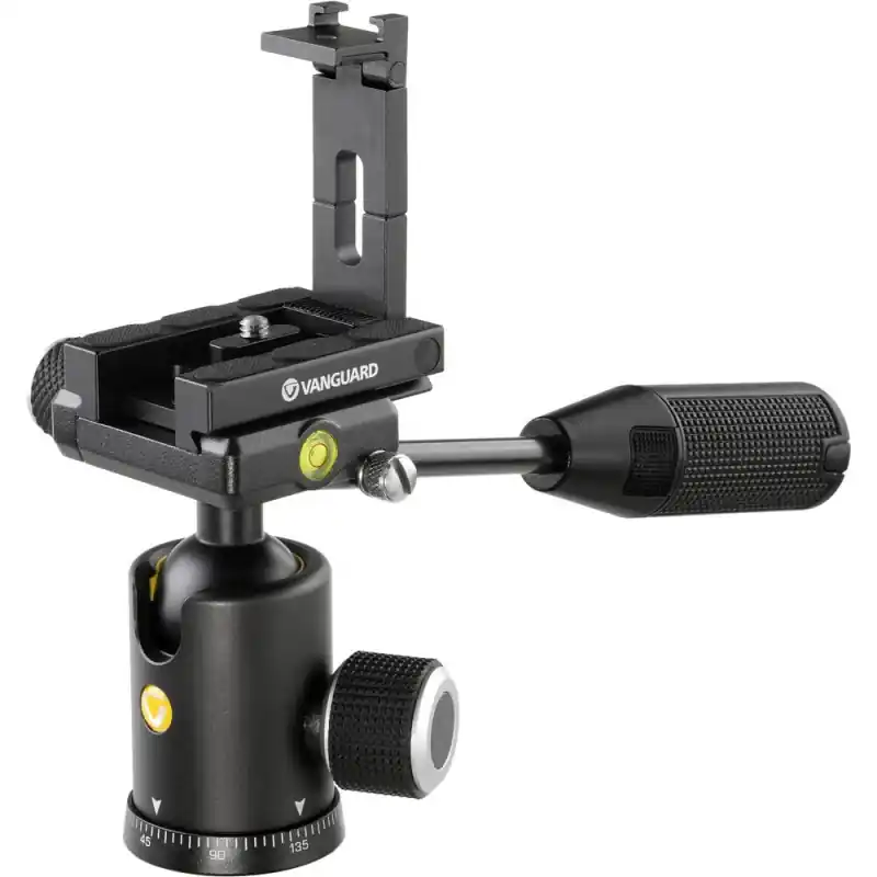 El cabezal de bola VEO BP-120T de Vanguard cuenta con una abrazadera tipo Arca e incluye una placa de liberación rápida Arca para conectar cámaras de hasta 26,5 libras. La placa de liberación rápida también se puede transformar en un soporte para teléfono inteligente. La sección central de la placa se levanta para admitir la mayoría de los teléfonos. Además, cuando esta sección central se levanta, ofrece un soporte para zapatos en la parte superior, para que pueda colocar un micrófono, una luz u otro accesorio encima de su teléfono inteligente. Además, se proporciona una rosca de 1/4 «-20 en el costado de la placa de liberación rápida para soportar aún más accesorios.