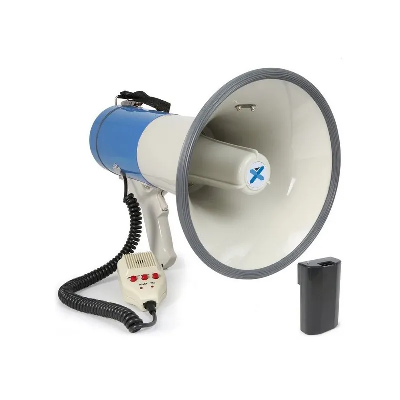 Potente megáfono con entrada USB/SD, Batería de litio, MP3 panel de control, amplificador integrado de 65W y micrófono anti-feedback con cable en espiral. Cinta de transporte ajustable, función sirena y control de volumen. Distancia 1,0 – 1,2km dependiendo de las condiciones.