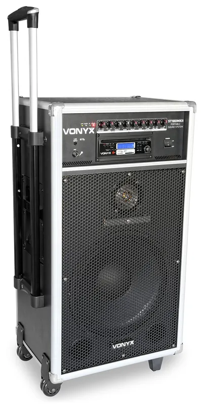 Sistema de sonido portatil de 12» profesional con CD y MP3 e incorpora receptor BT para audio streaming. Incorpora amplificador de 450W y alimentacion por doble bateria en una carcasa portatil con ruedas. Se suministra con 2 micros inalambricos de mano UHF, mando a distancia, asa retraible y ruedas. De facil transporte y con posibilidad de trabajo sin toma de corriente es ideal para aplicaciones en escuelas, gimnasios, bailes, camping y fiestas de karaoke.