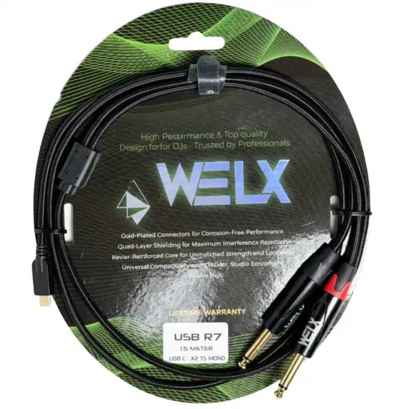 El WELX R7 es un cable adaptador USB‑C a dos salidas ¼″ TS mono, diseñado para convertir la señal digital de tu dispositivo en audio analógico de alta fidelidad, sin necesidad de drivers ni configuraciones. Perfecto para DJs que trabajan con equipos clásicos o modernos y necesitan una señal analógica profesional.