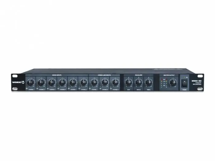 MMX 62 es un mezclador que incorpora 6 canales Mic/Line con alimentación phantom (+18 V a +21 V) y 3 canales stereo, con ecualizador de 3 bandas en su salida stereo Master. Está construido en carcasa metálica de 1 unidad de rack 19″. Dispone de una salida estéreo balanceada (XLR3) y otra desbalaceada (RCA), y una salida mono balanceada (XLR3). El primer canal incorpora un potenciómetro de ajuste de sensibilidad para establecer este como canal prioritario. Además, incorpora una entrada de alimentación DC 24 V para proteger el mezclador de un fallo eléctrico.