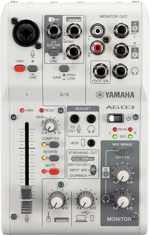 Yamaha AG03 MK2 es un mezclador de 3 canales e interfaz de audio USB con resolución de 24 bits/192 kHz y DSP incorporado diseñado para aplicaciones de Live Streaming.